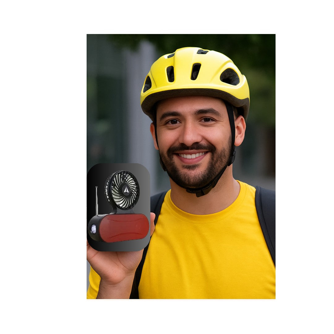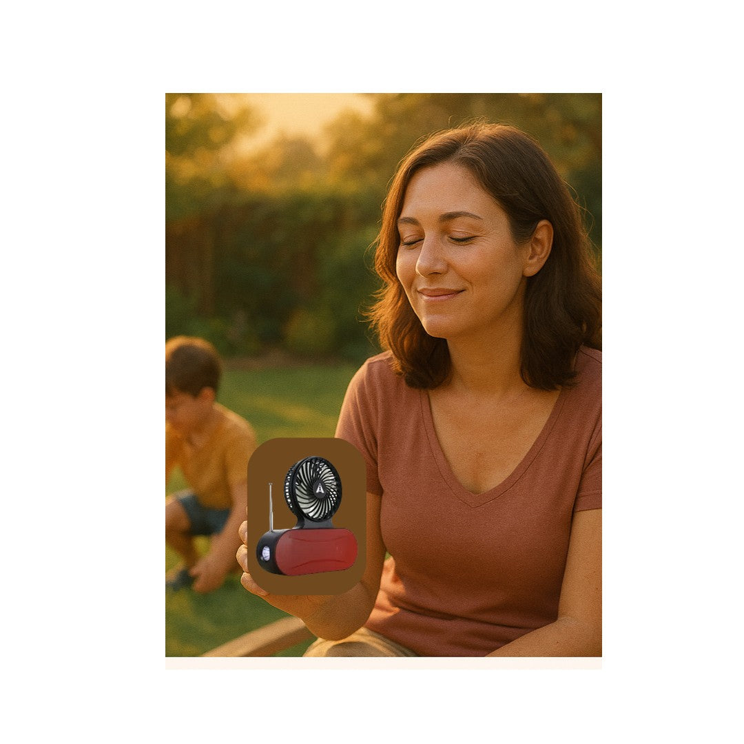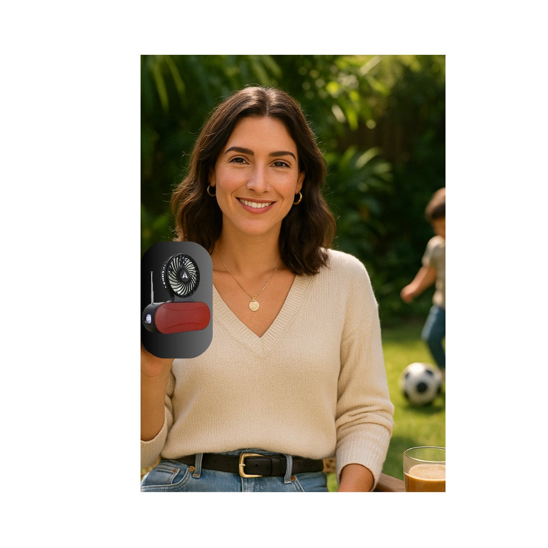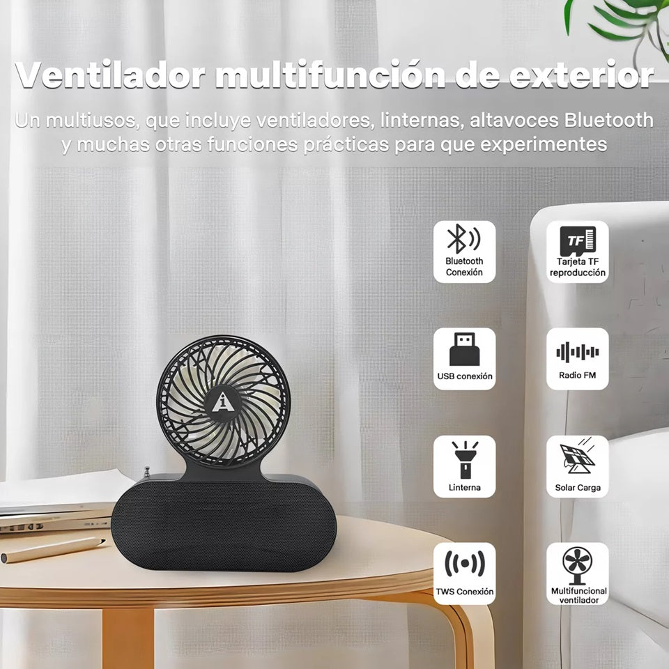 Tu aliado todo en uno: altavoz Bluetooth, linterna, ventilador, radio FM y cargador solar.